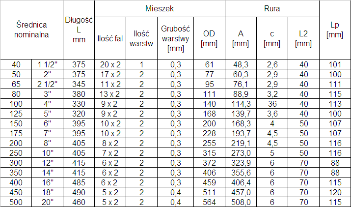 Uwaga: Poniższa tabela wymiarów uwzględnia wyłącznie rozwiązania typowe z katalogu. Na zamówienie wykonujemy kompensatory według dostarczonej dokumentacji.