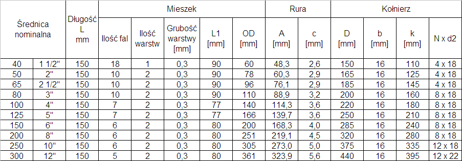Uwaga: Poniższa tabela wymiarów uwzględnia wyłącznie rozwiązania typowe z katalogu. Na zamówienie wykonujemy kompensatory według dostarczonej dokumentacji.