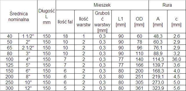 Uwaga: Poniższa tabela wymiarów uwzględnia wyłącznie rozwiązania typowe z katalogu. Na zamówienie wykonujemy kompensatory według dostarczonej dokumentacji.